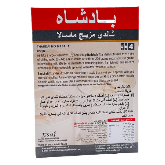 Bring the taste of summer into your home with Badshah Thandai Mix Masala. Enjoy a cup of India's favorite summer drink and make it exactly the way you like it. Our masala is a special blend of authentic Indian spices that have been expertly crafted to bring out the flavor of traditional Thandai. Badshah Thandai Mix Masala comes in convenient sachets that are easy to use and store. Make delicious Thandai in no time and impress your friends and family with your amazing drinks! Enjoy all the goodness of India's favorite summer drink in an easy-to-make, mess-free mix. Get yours today and savor the flavor!