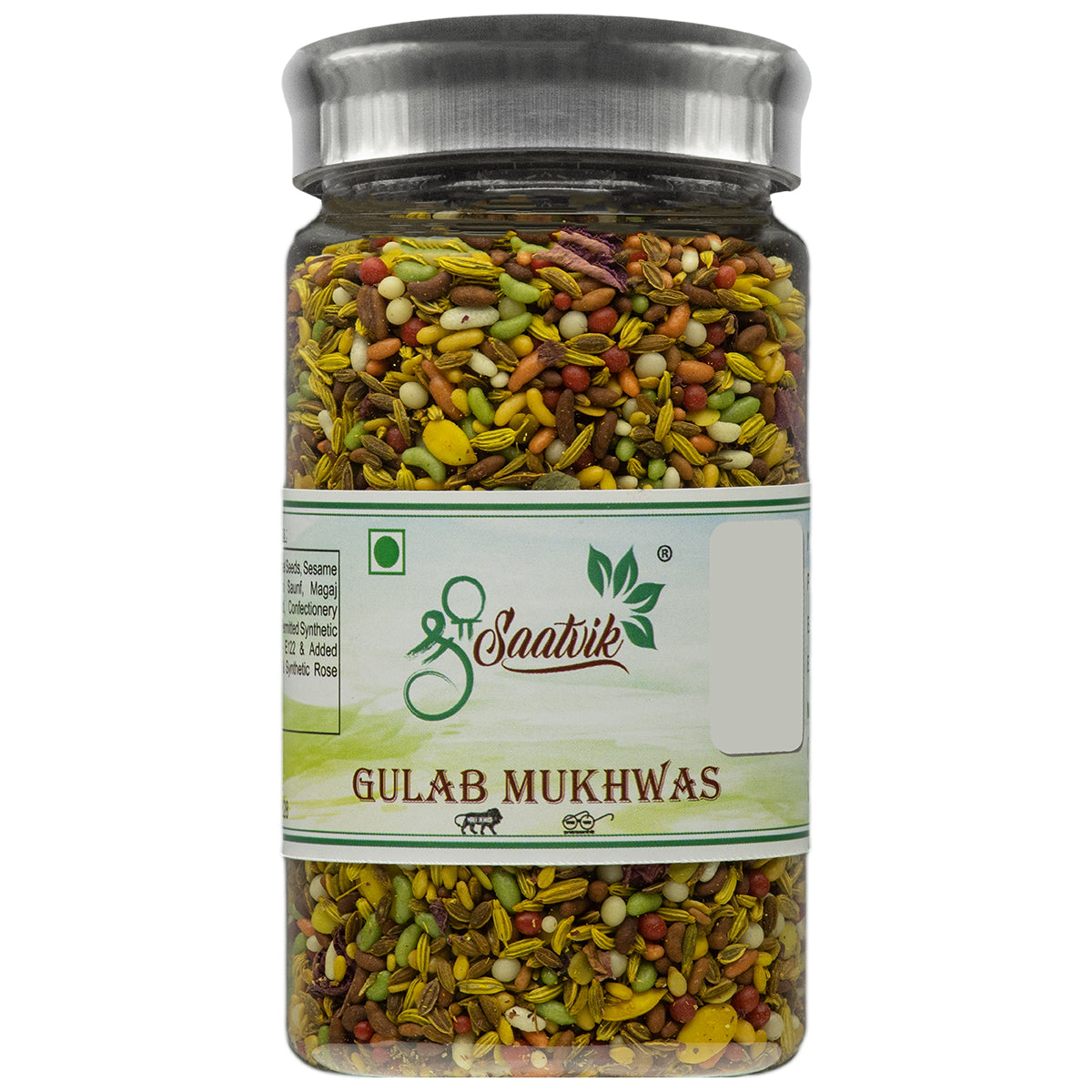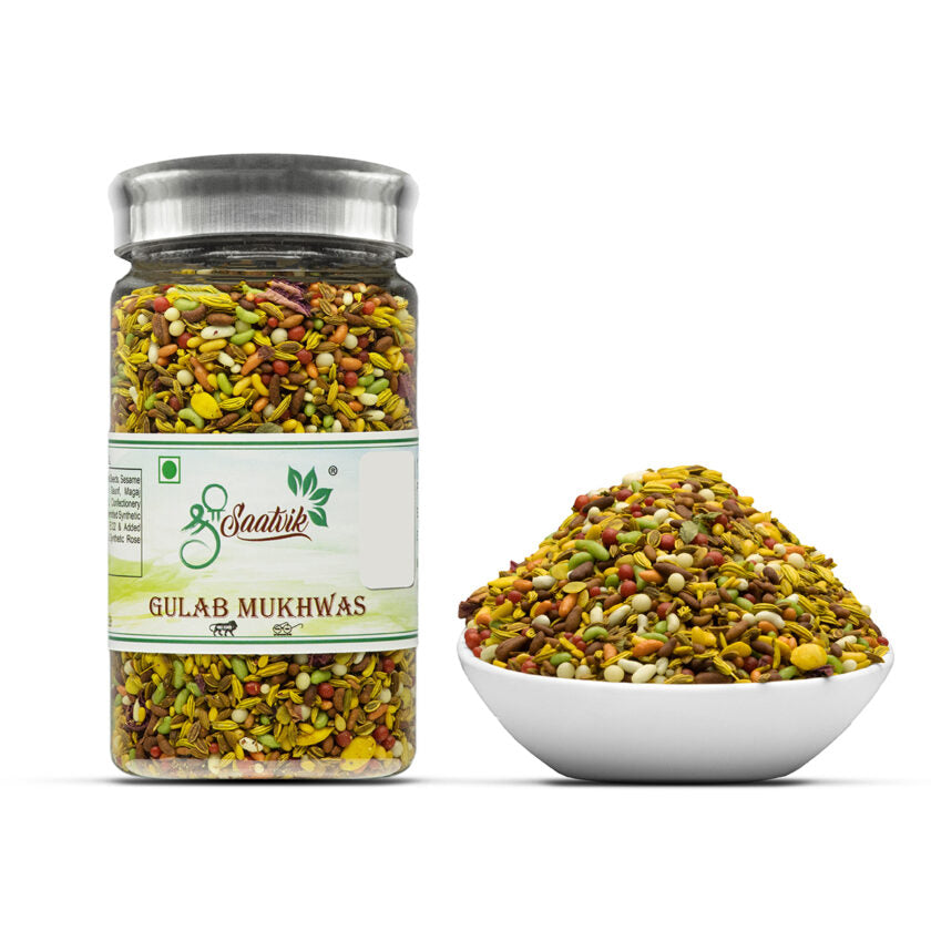 Gulab Mukhwas is a Ecstatic blend of Rose Petals, Fennel Seeds, Sesame Seeds, Magaj Seeds, green riband, melon seeds. Rose petals being rich in Vitamins A and E, is well known to ease digestive problems. Sesame seeds is a good source of fiber.